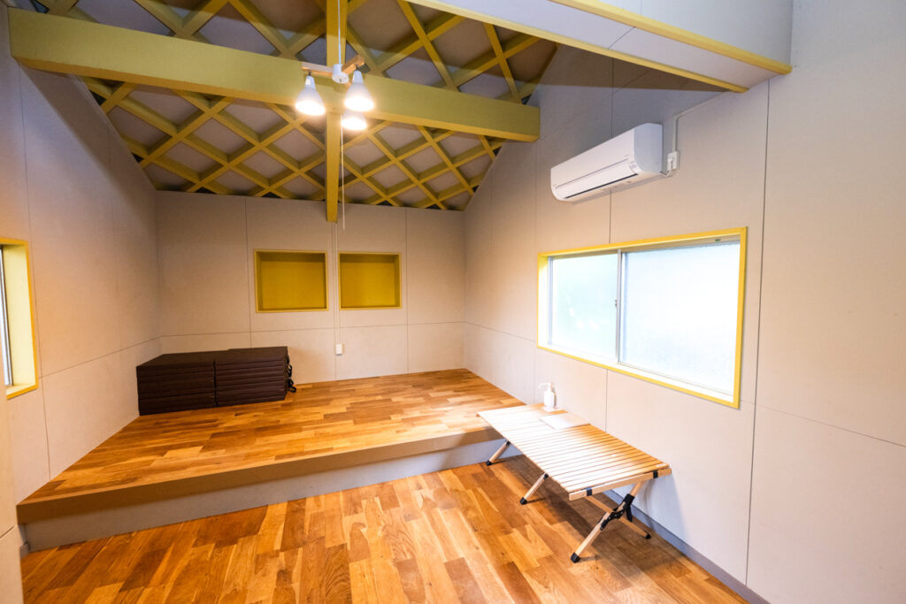 ロッジエリアでは、定員2名〜6名までのロッジがあり、グループやファミリーでのキャンプにも最適。タープのついたアウトドアリビングで焚き火やBBQも可能で、夜はエアコン付きの室内で快適に眠れます。